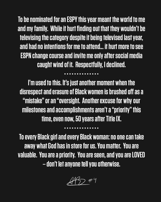 Social media caught wind of the exclusion and ESPN quickly sent a last minute invite to Boston, which she respectfully declined. She posted a personal statement on Twitter: